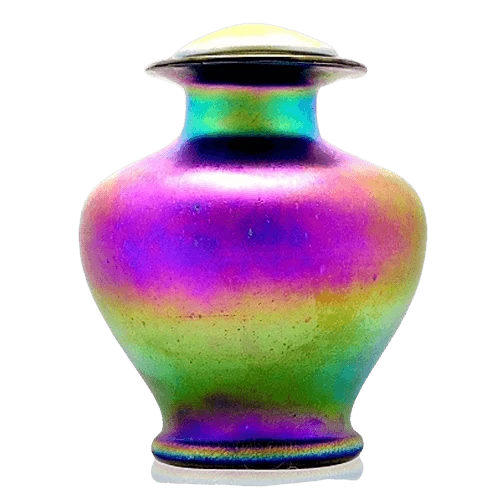 The Deep Sea Glass Cremation Urn is created from elegant artisan glass by a skilled artist who is an expert in the art of glass forming. This beautiful vessel features a gorgeous array of pink and other iridescent hues that capture the eye, and are reminiscent of a beautiful rainbow produced by a glass prism. The artist creates this effect by skillfully combining the shades in the glass, and then blowing the piece into the desired shape. This urn is sized to fit within a cremation niche that has a standard, twelve-inch height, and includes a small velvet pouch to store precious mementos, such as jewelry or a lock of hair. Regardless of where this piece is displayed, it will become an unforgettable final remembrance that is truly remarkable.