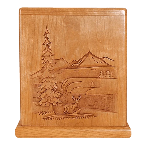 The Deer Cremation Urn is made from solid cherry wood with a satin finish, machine carved and laser etched to create that old fashioned hand carved look.