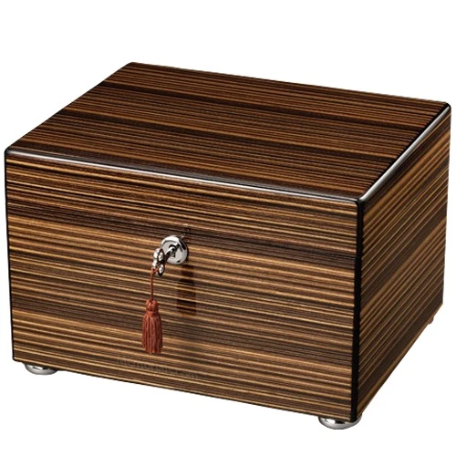 The Duality Chest Cremation Urn is made of wood and features a stunning ebony and natural stripe wood veneer. The urn rests on polished nickel ‘bun’ feet. The lock and nickel finished key tie in the details of the urn, while the tassel on the key beautifully compliments the contrasting finish. This urn will become a treasured tribute to your loved one.