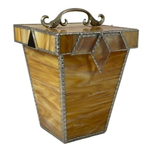 The Dusk is Coming Glass Cremation Urn is hand crafted by a talented artist with great passion. This urn features dark gold hues with cream accents throughout the textured, fuzed glass, which is accented with the brilliant metal edging. The urn also features an gorgeous knob on the lid, which tastefully matches the feet and is finished with the silver tassel on the front of the piece.