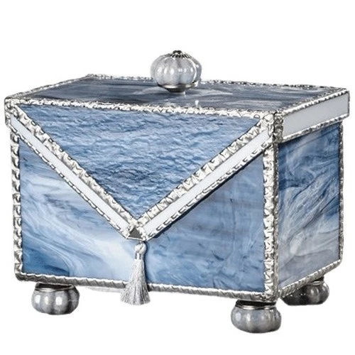 The Evermore Glass Cremation Urn is hand crafted by a talented artist with great passion. This beautiful urn features elegant swirling blue, grey, and white colors throughout the textured, fuzed glass, which is accented with the brilliant metal edging. The urn also features an gorgeous knob on the lid, which tastefully matches the feet and is finished with the silver tassel on the front of the piece.