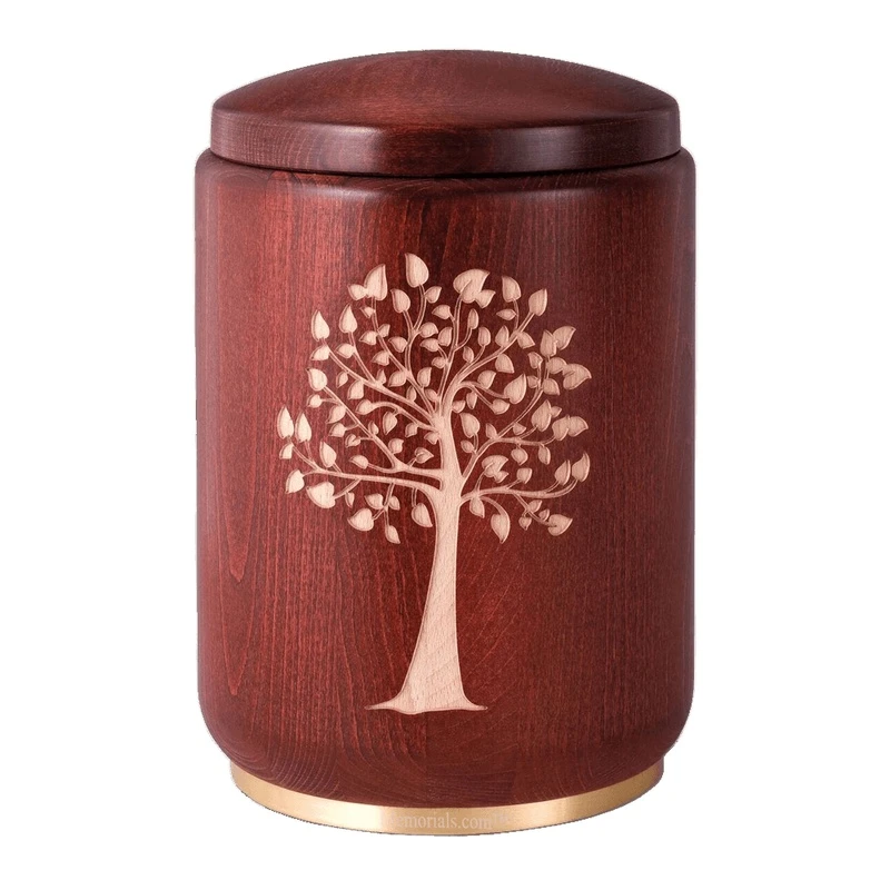 The Family Tree Wood Cremation Urn is crafted from beech wood with a mahogany stain. The milled motif and golden brass base creates a rustic style to hold the ashes of your loved one.