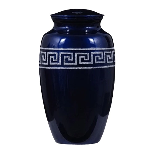 The Greek Key Metal Cremation Urn is made of metal and features a gorgeous, hand-crafted design. This beautiful urn is adorned with inlaid, egg-shell Greek key band, that is accented with a rich, blue finish. This elegantly artistic vessel will create an unforgettable tribute to a lost love.