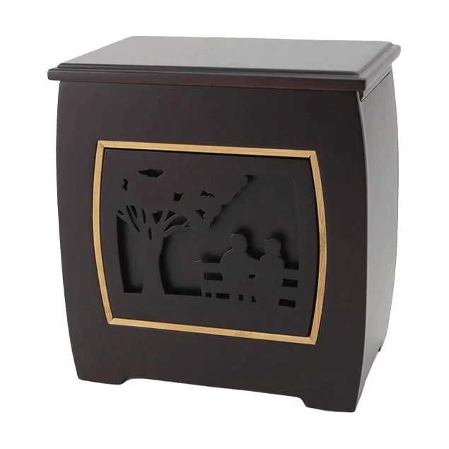 The Hiroto Couple Cremation Urn is beautifully crafted with a cherry wood finish featuring bamboo highlights. The side has a couple silhouette, outlined with a decorative metal panel. This beautiful urn will protect and preserve precious memories of your loved one.