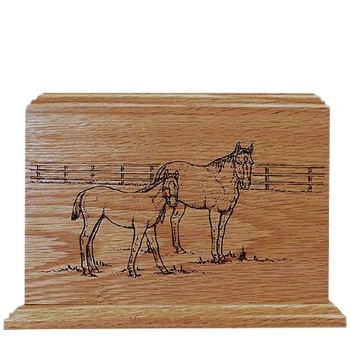 The Horses Walnut Wood Cremation Urn is made of walnut wood and features a natural stain and satin finish. The front of the urn is accented by an elegantly laser-etched scene. The peaceful scene combined with the natural material offers an elegant and dignified final resting place.