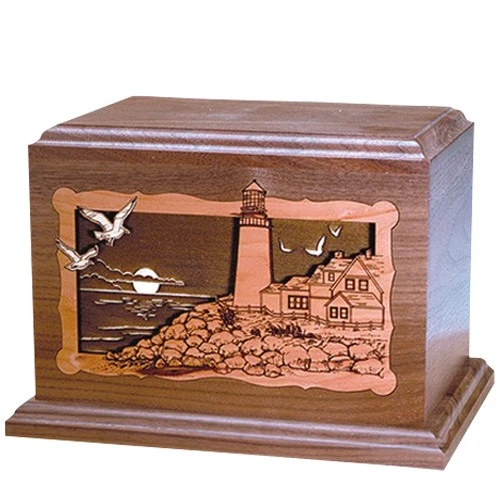 The Lighthouse At Night Walnut Wood Cremation Urn is made from walnut and other laser etched hardwoods. A unique urn will create a peaceful memory for eternity for you and your loved ones.