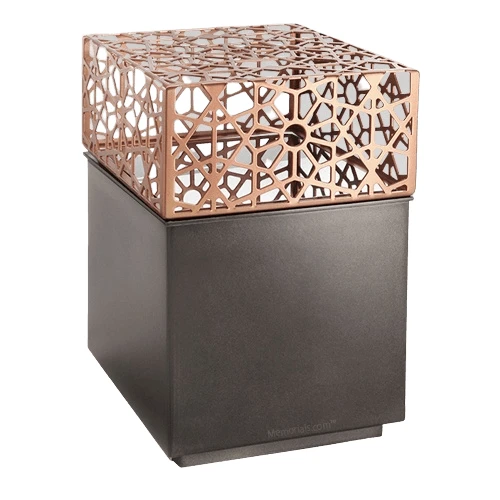 The Metrico Metal Cremation Urn is made in Italy by highly skilled artisans. This gorgeous cremation urn made of sheet metal and features an intricate and dynamic cut out pattern on the top. The beautiful pattern on the top is enhanced by the mirrored surface below it. This exquisite vessel will offer a truly elegant and unforgettable remembrance.
