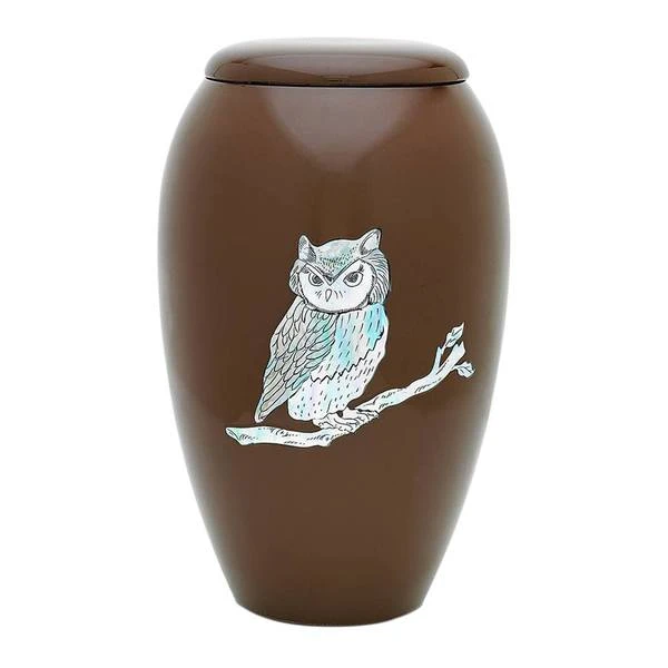 The Owl Cremation Urn is made of metal in a traditional shape. The beautiful mother of pearl owl sits on a branch over the rustic brown colored urn. This artistic vessel celebrates the quiet yet unforgettable moments in life.