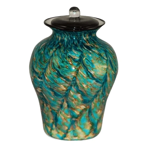 Each cremation urn is unique and hand blown one at a time the urn shown is a representative example; colors, shading and patterns of the glass will vary. This will give your loved one a truly unique cremation urn made specially for your loved one.