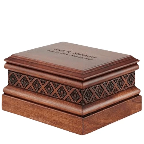 The Tudor Wood Cremation Urn is made from poplar wood with a beautiful, dark finish. This elegant urn is adorned with a wonderfully detailed floral inlay, giving it an old-worlde look. This chest also includes a plastic insert to contain the remains. This piece will offer a dignified and peaceful final resting place.