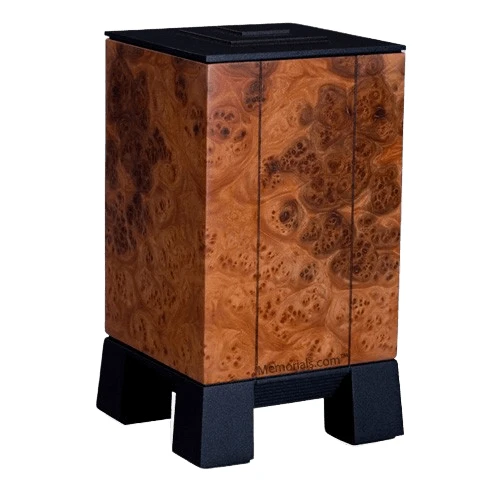 The urn is burled maple vener combined with an adaptation of the oriental art of lacquer consiting of multi layers of resinous varnish imparting high polish to wood. This work is done by a skillful artisan using a specific adhesive and many layers of varnish with a polyester base, handsanded between each layer. That seals the surface and make it waterproof and resistant. The fabricating delay of that unit is usually 6 weeks because of the drying time of the products between the successive operations. This urn is one of a kind urn, each wood peace is unique.